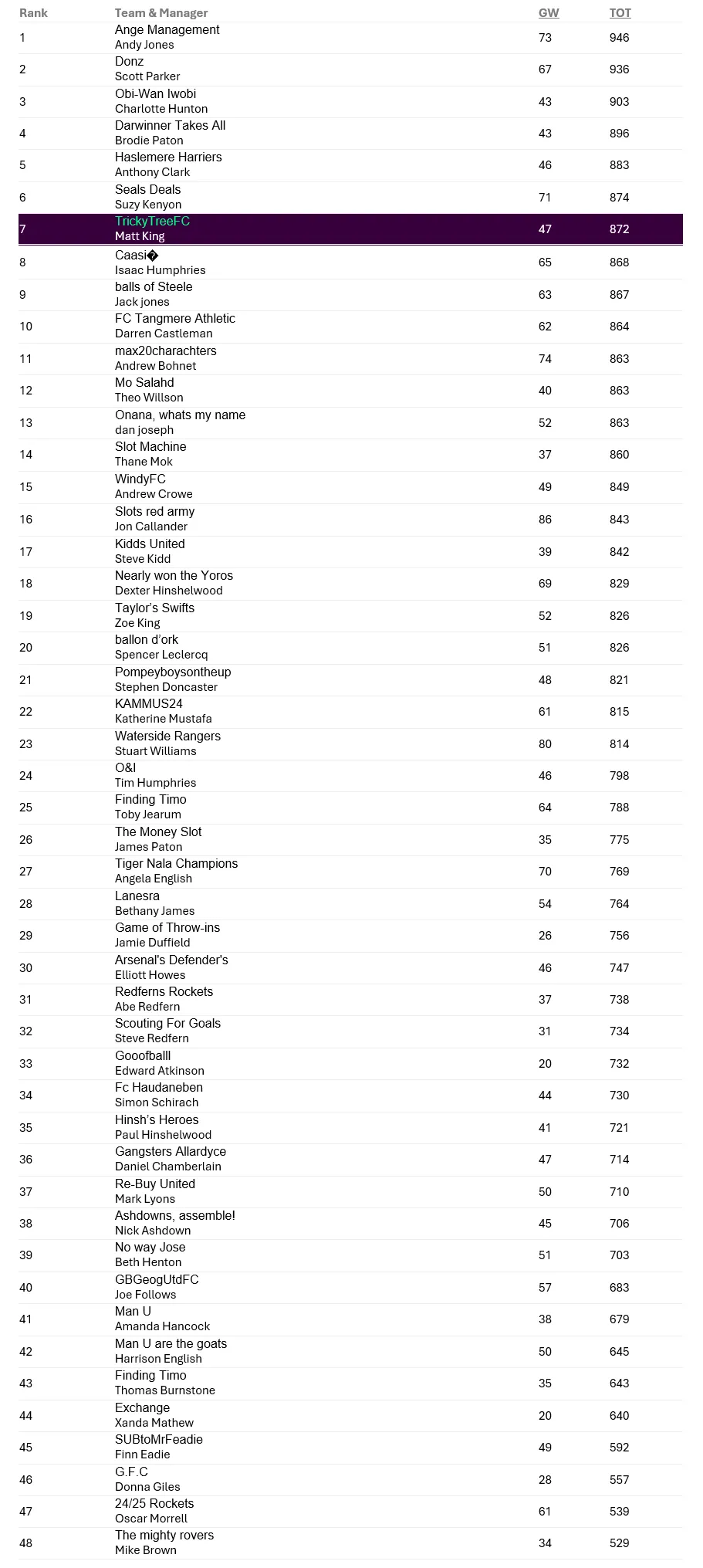 As we go into our Christmas break there will be a whole line of real world managers complaining there is too much football over the holiday. Not so for us! It could be all change in the Great Ballard FPL by January so we thought a look at the table before the madness starts might be helpful. The race to the top is tight, with a mixtures of familiar names and new pretenders, but so too is the race to the bottom with no clear winner emerging yet for the coveted wooden spoon. We will publish the table again in January so stay busy with your scouting and transfers over the break!